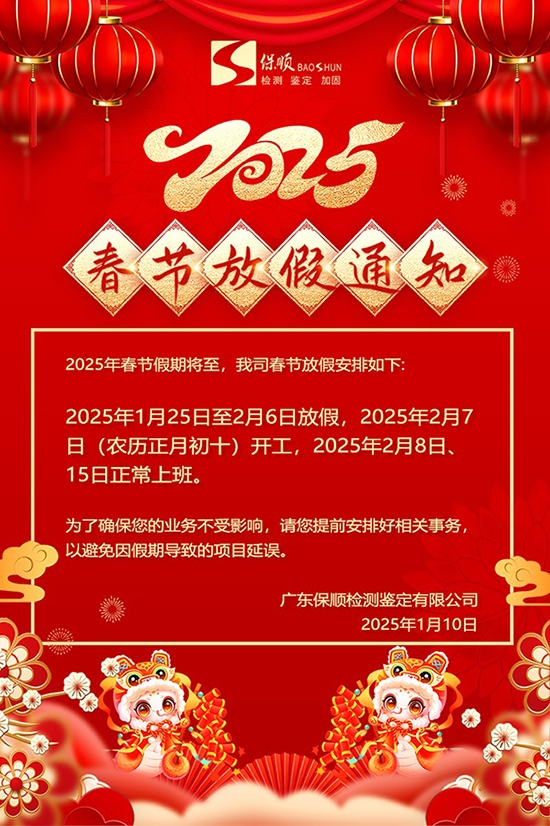 2025年春節(jié)假期將至,廣東保順檢測(cè)鑒定有限公司2025年春節(jié)放假安排如下: